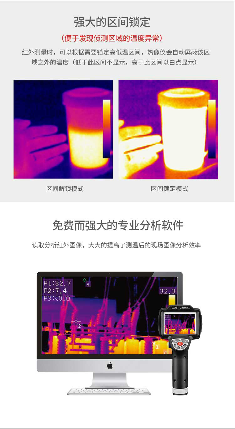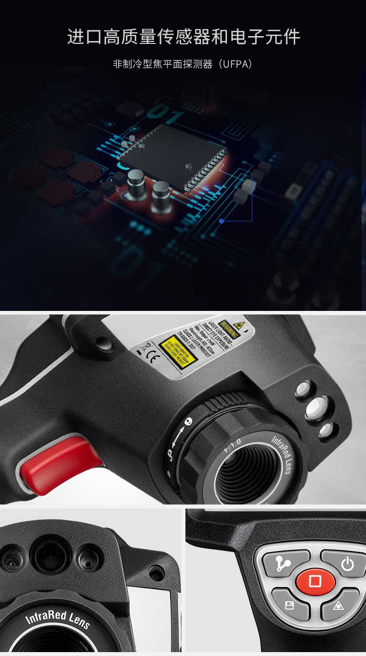標(biāo)配鏡頭7.5mm,分辨率160×120,IFOV:3.33mard,視場角29.8×22.6°,熱靈敏度NETD<0.08℃,圖像幀頻50Hz,溫度范圍(-20-150、0-400),可見光分辨率640×480像素