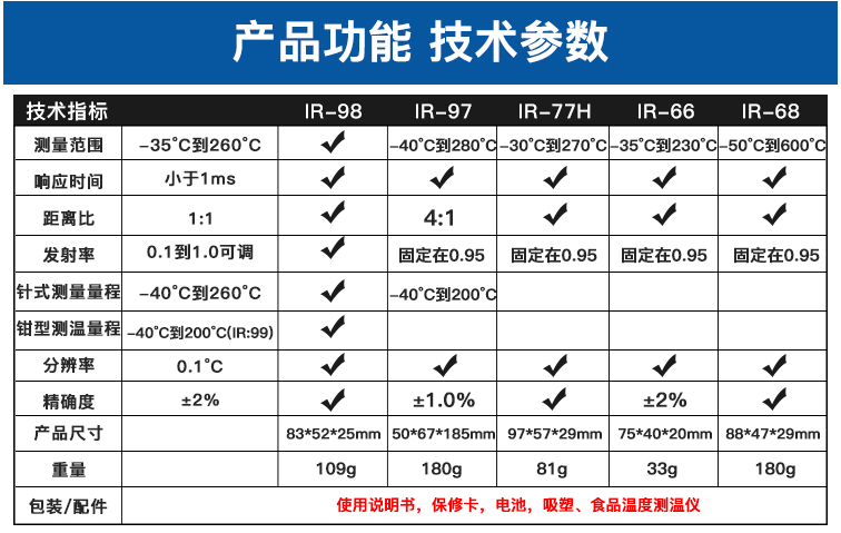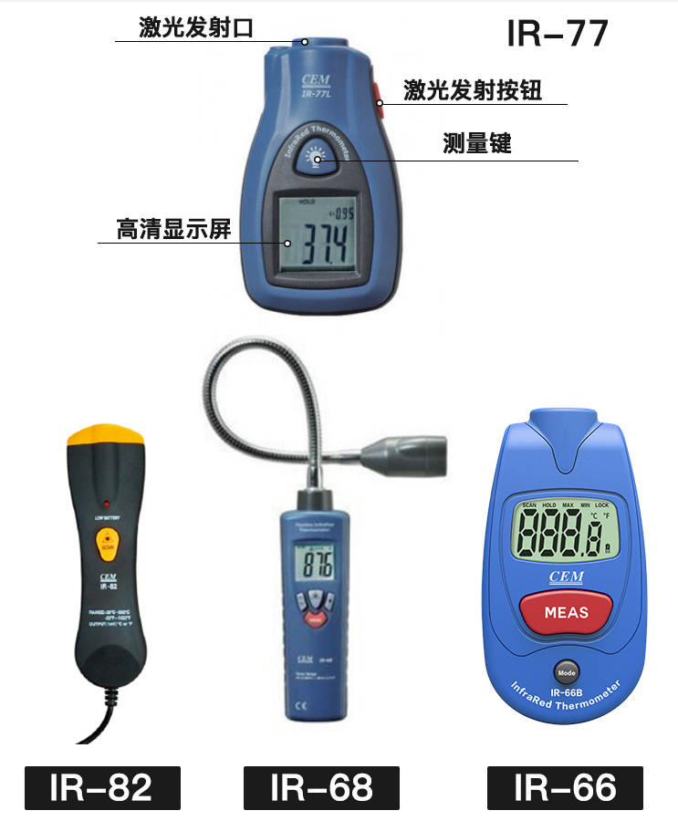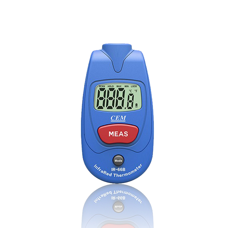 IR-66掌上式紅外測溫儀包括IR-66、IR-66B兩個型號。 CEM出品的IR-66系列掌上式紅外線測溫儀,符合人體工程學設計,其體積比手掌還小,方便攜帶,是您工作上各種設備檢修、溫度情況了解,以及您日常生活起居的多功能測溫儀佳選擇。 IR-66掌上式紅外線測溫儀特性: 1.*的非接觸式測量 2.獨特新穎的外觀設計 3.自動關機及自動記錄數據 4.℃/℉ 轉換裝置 5.自動量程選擇及大小值記錄 6.小巧的尺寸設計使測量方便又便于攜帶 7.大的液晶顯示屏 8.上鎖功能及低電量提示