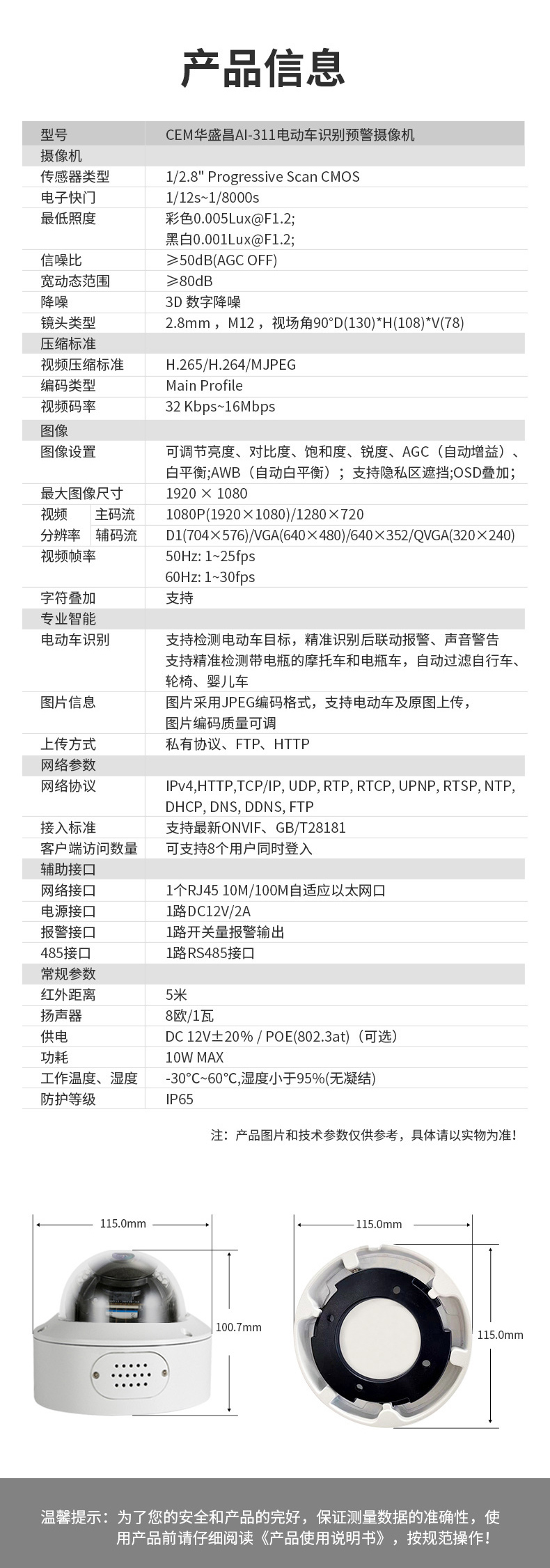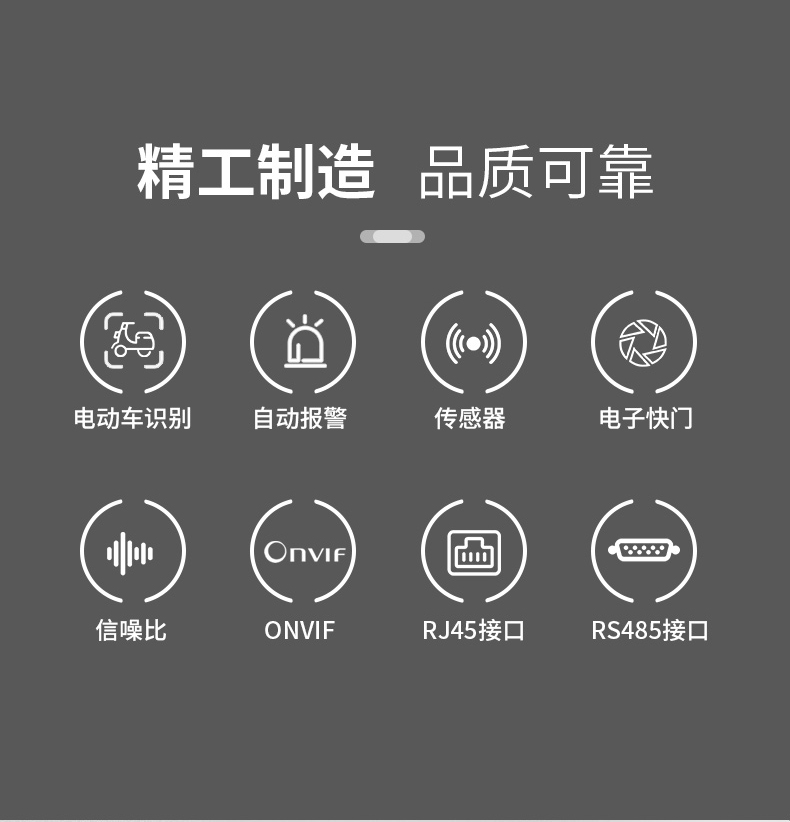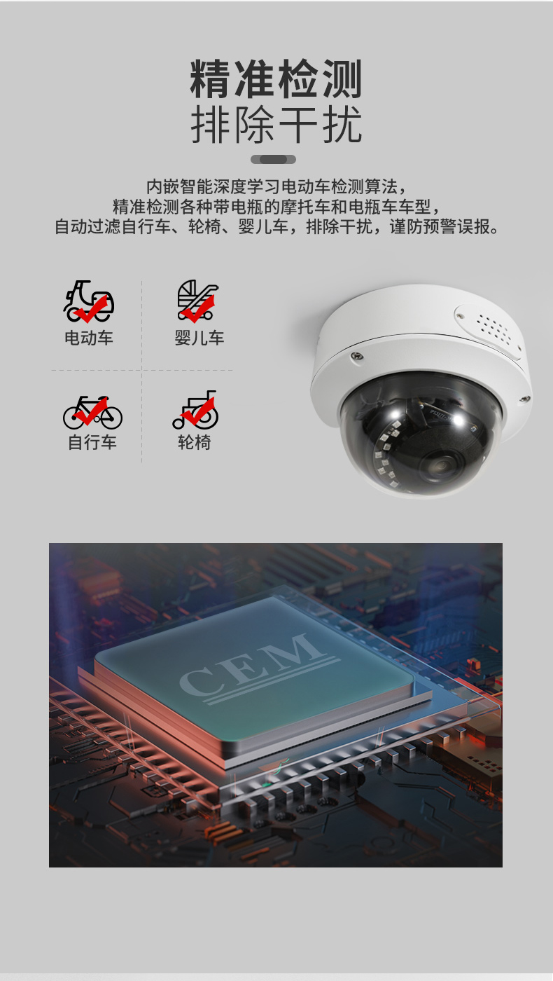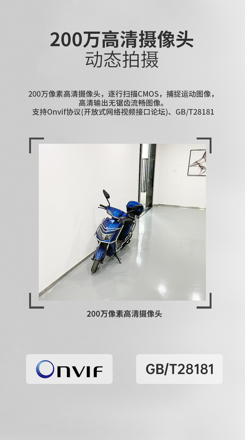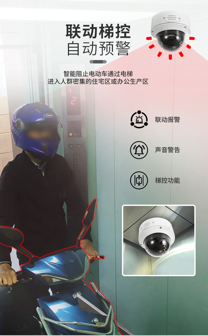 電動車識別預(yù)警攝像機(jī):電動車識別預(yù)警攝像機(jī)設(shè)備嵌入電動車識別算法,實現(xiàn)對電動車檢測分析識別,實時預(yù)警周界區(qū)域內(nèi)電動車闖入事件,前端攝像機(jī)一體化完成分析、識別、預(yù)警,并上傳平臺。