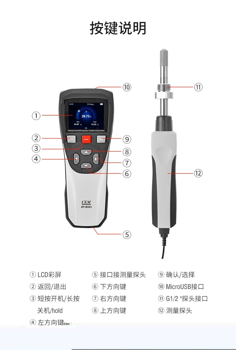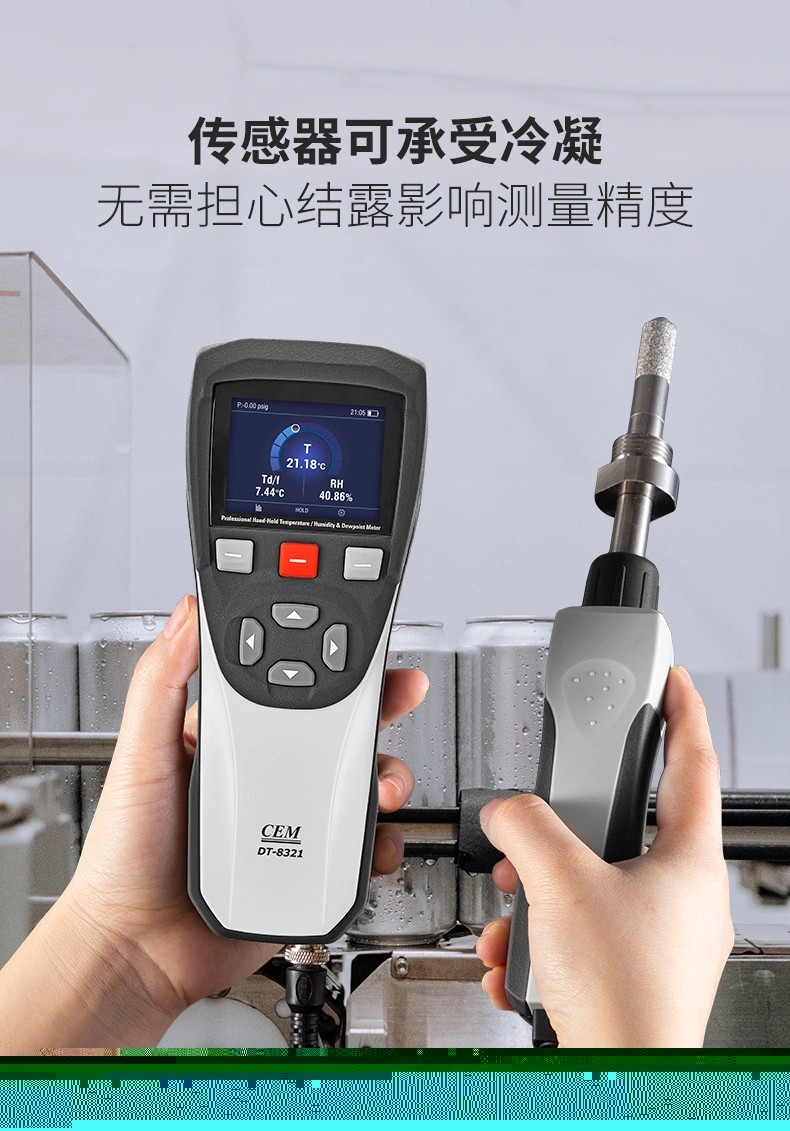 產(chǎn)品概述 CEM DT-8321是CEM華盛昌新設(shè)計(jì)、研發(fā)和制造的一款高精度專業(yè)手持式露點(diǎn)儀,精度高范圍廣,能在較寬的測量范圍內(nèi)準(zhǔn)確測量露點(diǎn)溫度,探頭可直接插入加壓過程中,并快速響應(yīng)測試過程環(huán)境條件,為工業(yè)露點(diǎn)測量應(yīng)用提供準(zhǔn)確快速的測量。產(chǎn)品廣泛應(yīng)用于實(shí)驗(yàn)室、電力電氣、SF6氣體測量、精密制造、化工制藥等領(lǐng)域的大溫度、大壓力范圍內(nèi)的直接過程露點(diǎn)測量。 產(chǎn)品優(yōu)勢 性能穩(wěn)定,維修成本低,可專業(yè)用于工業(yè)現(xiàn)場檢測和戶外校驗(yàn)等場合。 高品質(zhì)傳感器,測量更準(zhǔn)確,適用于低露點(diǎn)測量。測量范圍達(dá)-50至+30°C,低濕度測量<5%RH。●傳感器可承受凝結(jié),無需擔(dān)心結(jié)露影響測量精度。 傳感器探頭具備凈化功能以及加熱功能,預(yù)熱時間短,測量結(jié)果更穩(wěn)定。 靈活的數(shù)據(jù)記錄功能,可設(shè)置自動記錄間隔,CSV文件可以通過USB傳輸?shù)絇C端。 測量數(shù)據(jù)可一鍵保存,可使用電腦中的Excel軟件查看。 外形堅(jiān)固,緊湊,小巧,外加藍(lán)色彩屏設(shè)計(jì),界面更加直觀簡潔。 可充電設(shè)計(jì),持久續(xù)航更方便。