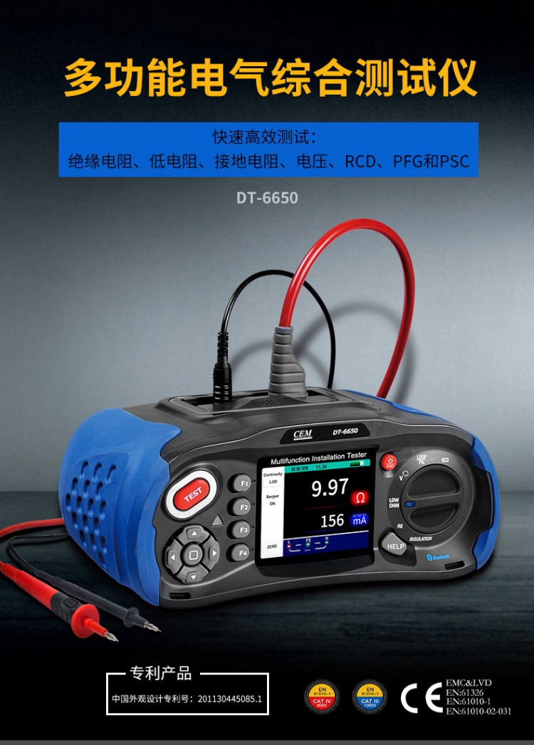 CEM DT-6650專業(yè)的多功能電氣綜合測試儀, 3.5"高清彩色TFT液晶顯示屏,雙注塑機(jī)殼,可測絕緣電阻、接地電阻、低電阻、回路電阻、電壓、RCD、PFG和PSC,并有配套軟件系統(tǒng),同時具有快速取樣、雙顯示、清晰的按鍵和大屏等優(yōu)點(diǎn),方便用戶簡單清晰地操作,可以確保電氣裝置在家庭、商業(yè)、工業(yè)等領(lǐng)域應(yīng)用的安全性,以及固定接線安裝的安全性和準(zhǔn)確性,是電力電氣領(lǐng)域的專業(yè)電力檢驗(yàn)工具。