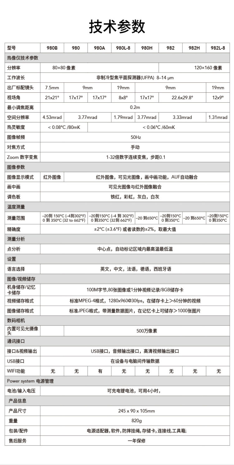 標(biāo)配鏡頭19mm,分辨率160×120,IFOV:1.31mard,視場(chǎng)角12×9°,熱靈敏度NETD<0.06℃,圖像幀頻50Hz,溫度范圍(-20-150、0-350),可見光分辨率500萬像素