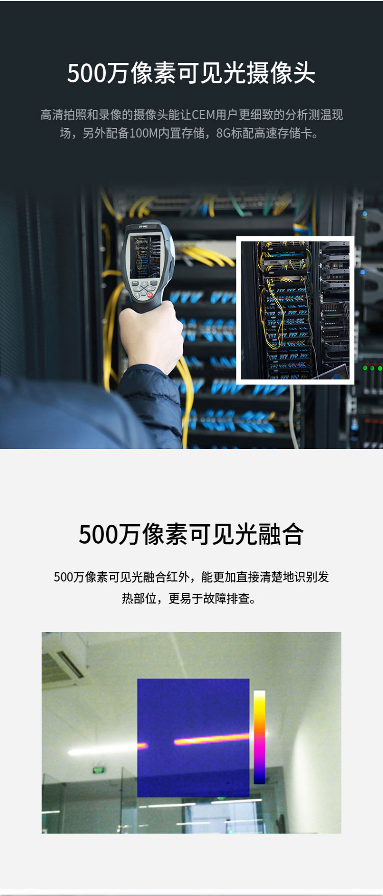 產(chǎn)品特性 1、更小的空間分辨率IFOV ;2、50Hz圖像幀頻; 3、精確測溫和高清紅外成像﹔4、32倍連續(xù)數(shù)字變焦; 5、強大的區(qū)間鎖定﹔6、高低溫自動追蹤; 7、500萬像素可見光攝像頭;8、500萬像素可見光融合;9、免費而強大的專業(yè)分析軟件。 10.AUF紅外熱成像和可見光自動融合功能11.靈巧緊湊的設(shè)計,2米防摔