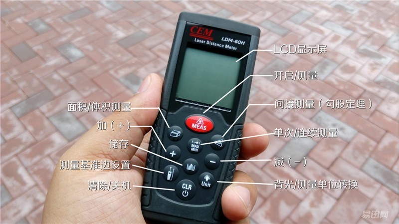 LDM-60H激光測(cè)距儀的功能按鍵為10鍵分布,紅色按鍵為開關(guān)鍵和測(cè)量按鍵。其他9鍵分別對(duì)應(yīng)日常測(cè)量工作所需的各種功能。激光測(cè)距儀可使用的范圍還是比較廣的,比如距離測(cè)量、房屋驗(yàn)收、室內(nèi)裝修、家具安裝、工程測(cè)量、機(jī)械工程、交通消防、規(guī)劃行業(yè)、裝潢行業(yè)、倉(cāng)庫(kù)物流、建筑施工等,所以,這9鍵對(duì)應(yīng)的功能還是很實(shí)用的。后邊,筆者將就自己用到的一些功能分享出來(lái)。