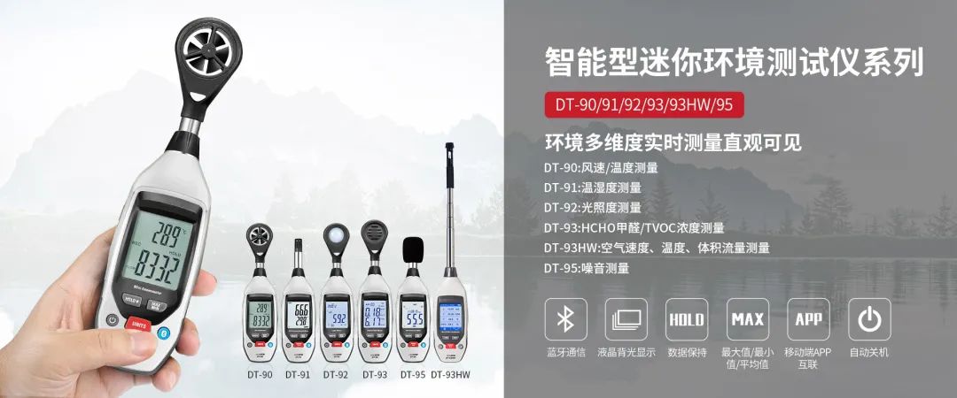 CEM華盛昌推出智能型迷你環(huán)境測試儀DT-90系列,為環(huán)境質(zhì)量多維度的測量檢測應(yīng)用上提供了產(chǎn)品解決方案和技術(shù)支持。這里所指的“多維度”,指對環(huán)境質(zhì)量的風輪式風速/溫度、溫濕度、光照度、甲醛/TVOC濃度、空氣速度/溫度/體積流量及噪音的多指標一站式智能測量。