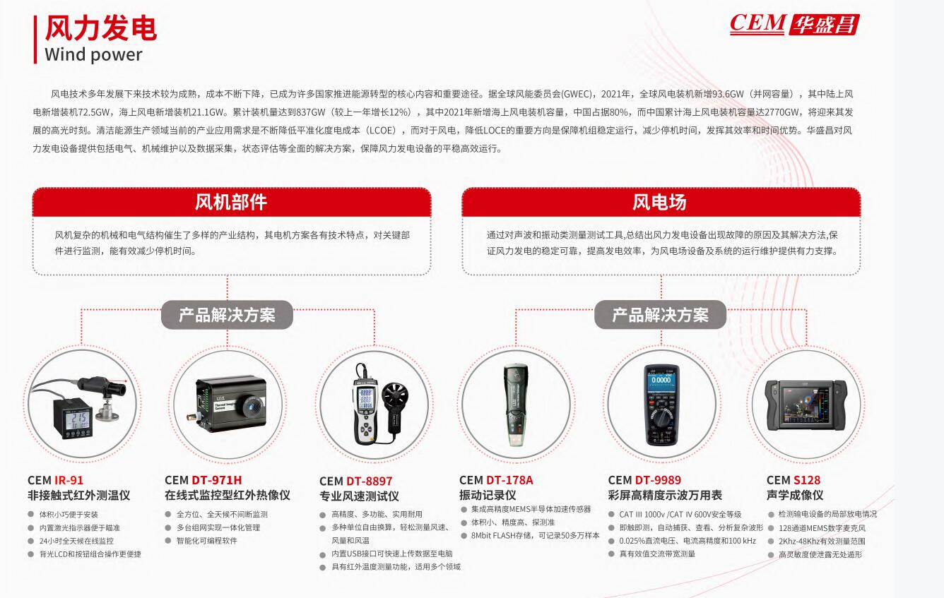 電新增接機(jī)7.6W,海上風(fēng)電斯新增裝機(jī)211G6W。累計(jì)裝機(jī)量達(dá)到3375W(較上一年增長12%),其中201年新增海上風(fēng)電較機(jī)容量,中國占據(jù)80%,而中國累計(jì)海上風(fēng)電裝機(jī)容最達(dá)7OCSW,將迎來其發(fā)展的高光時(shí)刻。浦潔能源生產(chǎn)領(lǐng)域當(dāng)前的產(chǎn)業(yè)應(yīng)用需求是不斷降低平淮化度電成本(LCOE),而對于風(fēng)電,降低LOC的重要方向是保嘀機(jī)組穩(wěn)定運(yùn)行,減少停機(jī)時(shí)間,發(fā)揮其效率和時(shí)間優(yōu)勢。華盛昌對風(fēng)力發(fā)電設(shè)備提供包括電氣、機(jī)械維護(hù)以及數(shù)據(jù)采集,狀態(tài)評估等全面的解決方案,保障風(fēng)力發(fā)電設(shè)備的平穩(wěn)高效運(yùn)行。